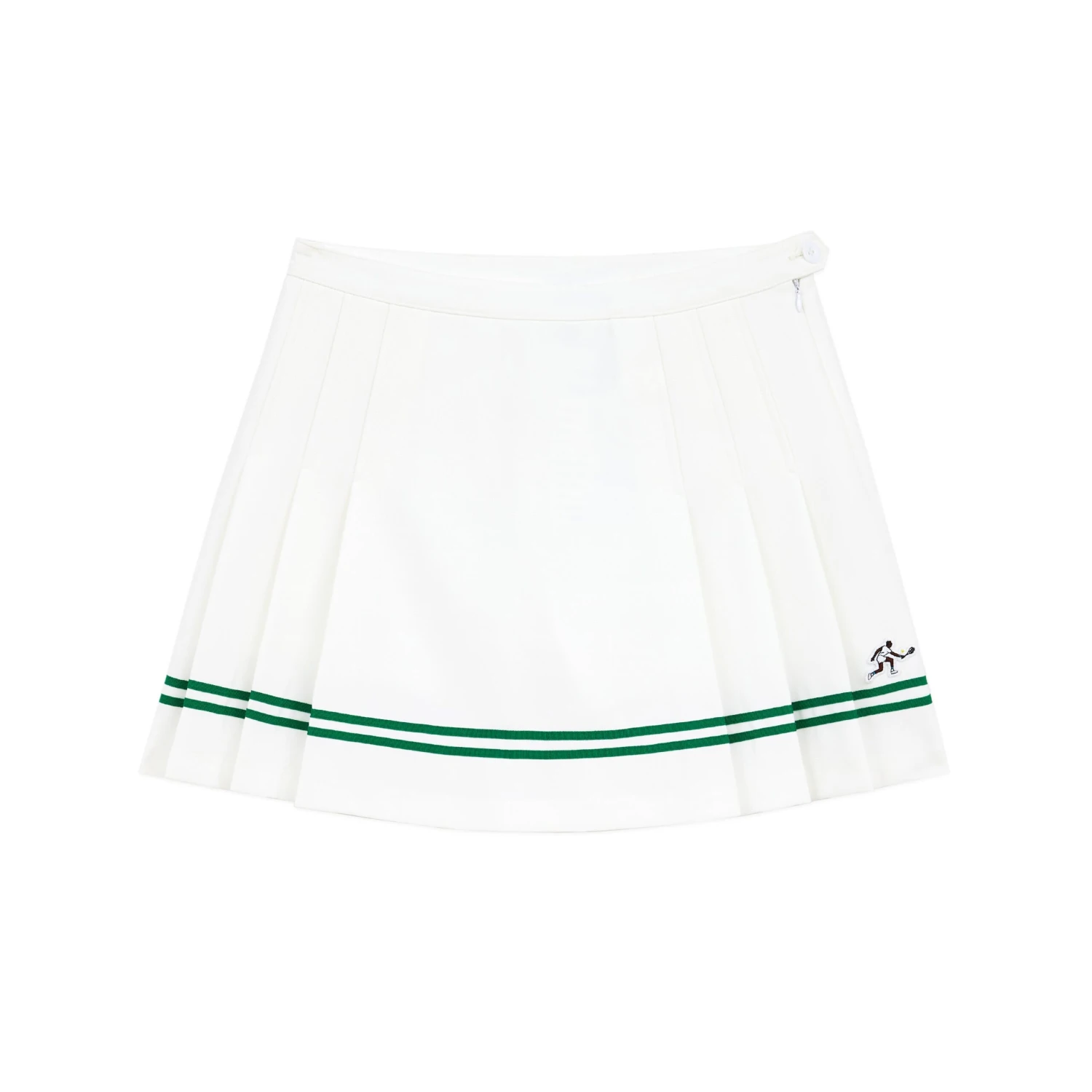 Pleated women’s tennis skirt/shorts combo featuring top-applied grosgrain trimming, an invisible zipper on the left side seam, and an embroidered Arthur Ashe icon on the left leg.