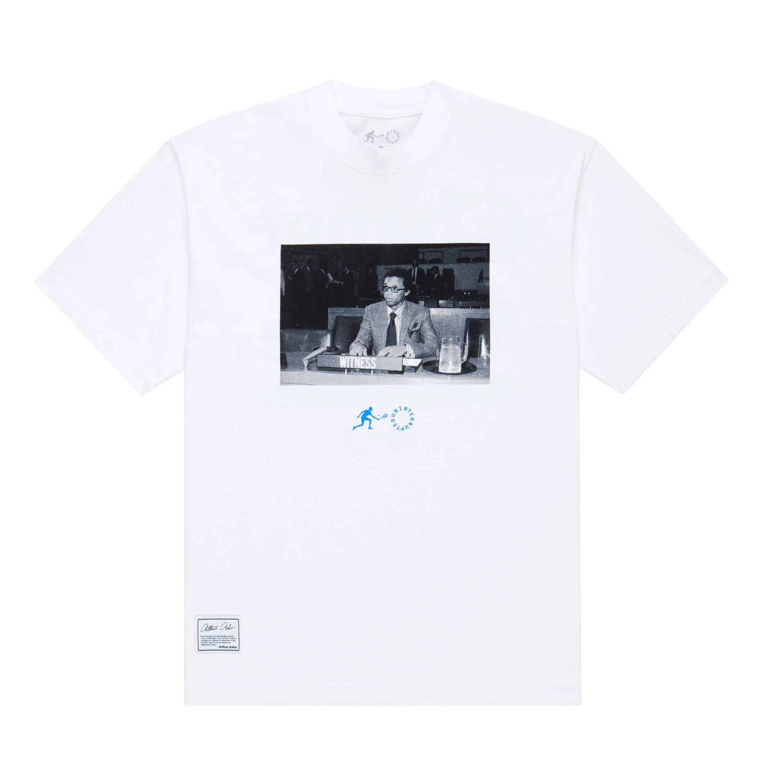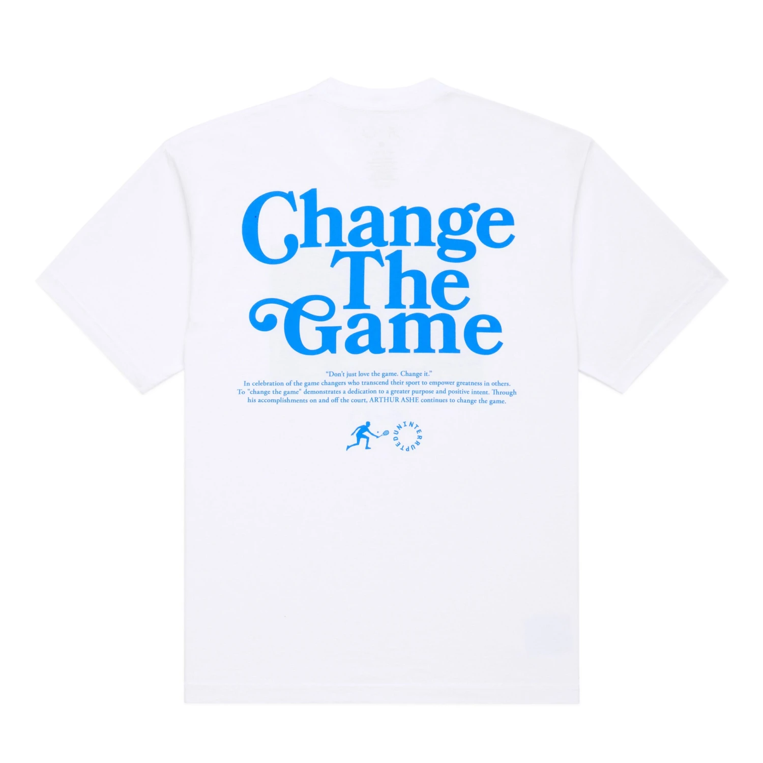 Arthur Ashe x UNINTERRUPTED t-shirt featuring co-branded detailing and an original “Change the Game” motif inspired by a quote of Ashe’s.