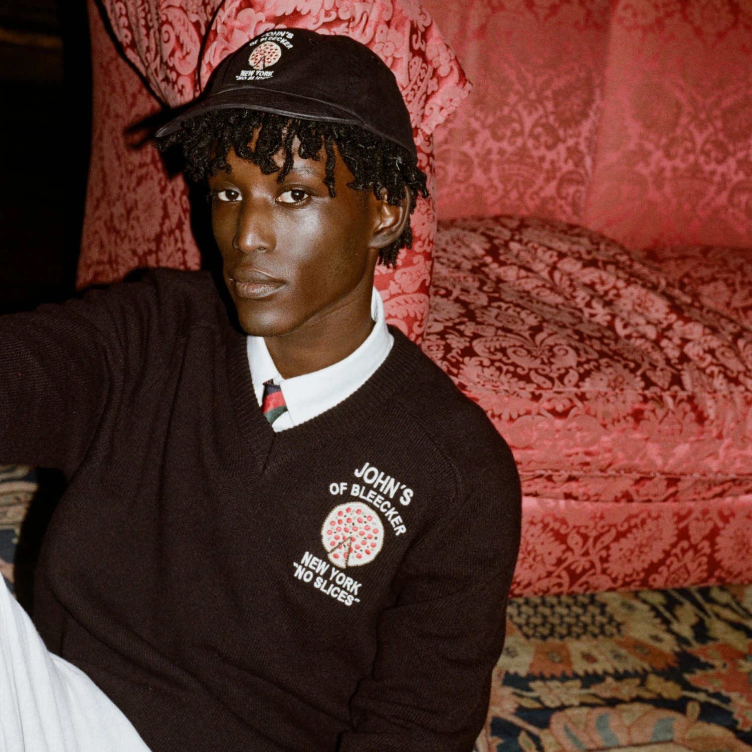 Rowing Blazers Creative Director and founder Jack Carlson has long been a fan: “John’s of Bleecker is my favorite pizza place in New York City. Everyone’s got their own opinion on this subject, but I think I’m in good company, including the many, many, (many) celebrities whose photographs adorn the wood-paneled walls, covered with generations of initials carved by New Yorkers and visitors. John’s is famous for having the oldest pizza oven in New York City, and for its strict ‘NO SLICES’ policy. As a regular, I always enjoy sitting in the main dining room and watching two neophytes come in and say, ‘Let me get two slices of —,’ only to be interrupted with the John’s motto: ‘No slices.’ It’s on the awning outside and basically everywhere you look. But you’re going to want a whole pie anyway. John’s is, among other accolades, also the most consistent pie in New York. Perhaps that’s the result of the incredible team which includes many that have been at John’s for decades. You can spot them, because they’re wearing John’s gear with vintage versions of the pizzeria’s logo. Two of my favorites are what we call the ‘Mario Brothers’ bricks logo, and (what else?) the ‘No Slices’ logo, which consists of a little embroidered pie and the words ‘NO SLICES’ in all-caps. We’ve collaborated with the amazing folks at John’s to recreate some of this vintage apparel with the original logos. They’re old-school and look almost bootleg. But they’re not. They’re the real deal — just like John’s of Bleecker Street.”