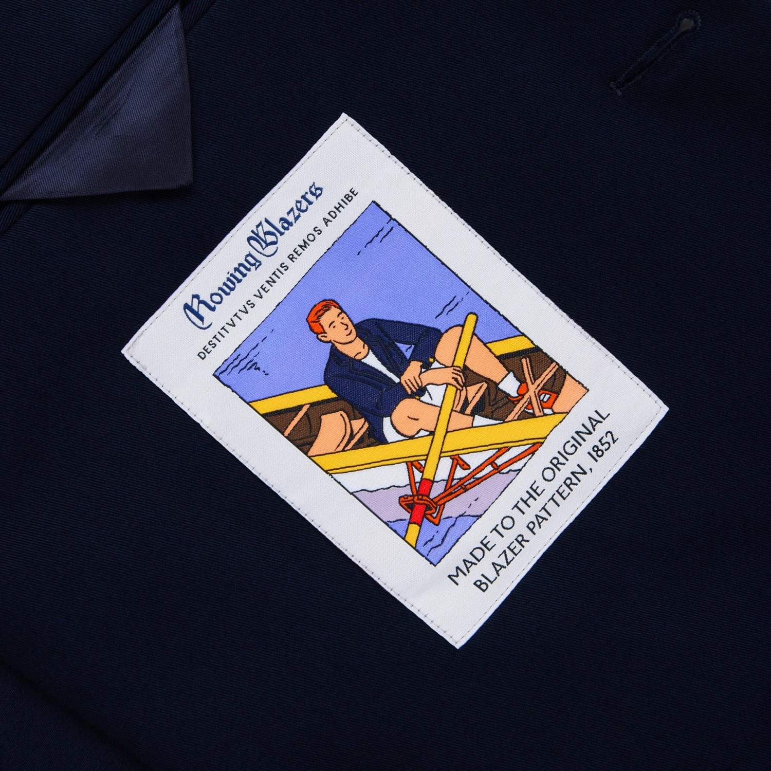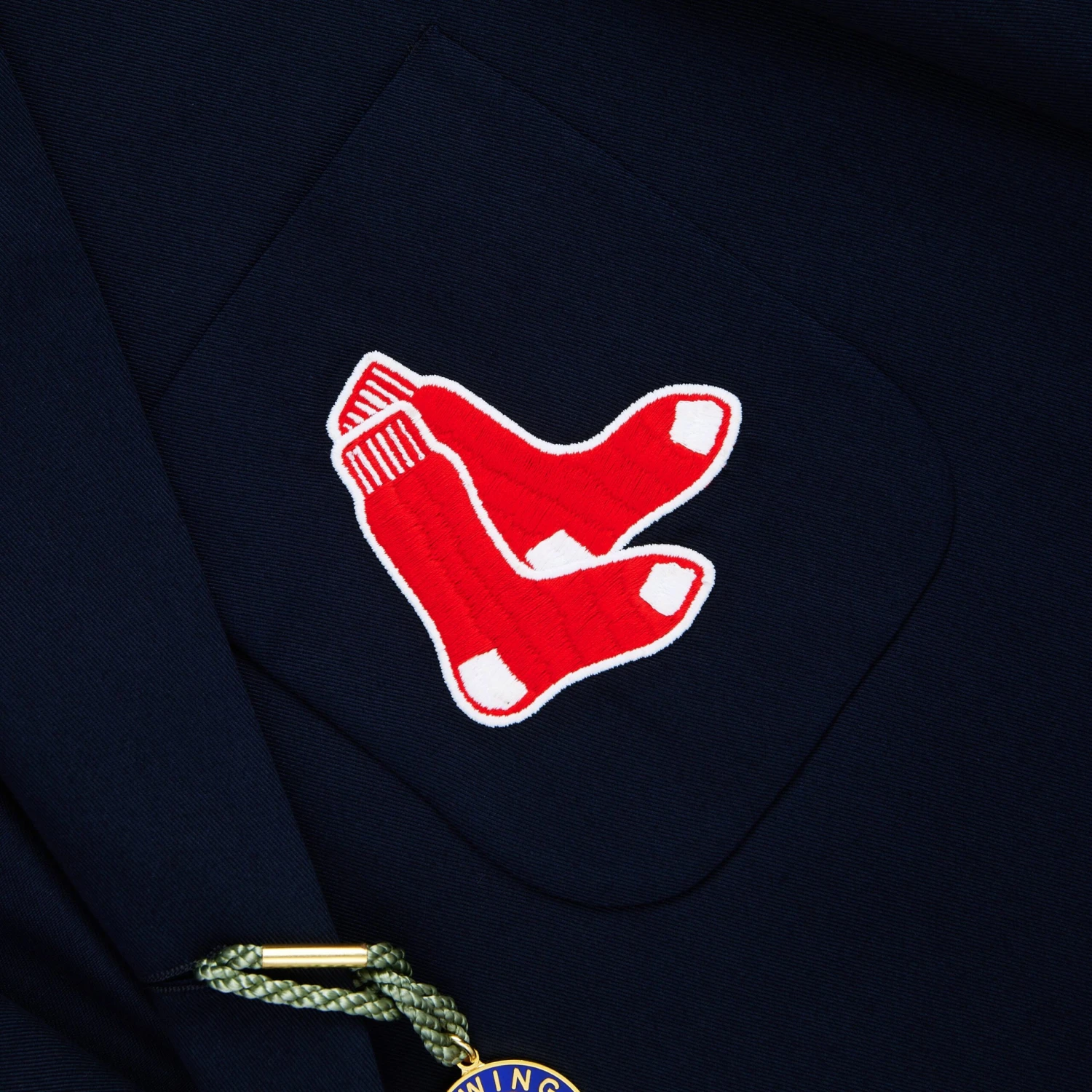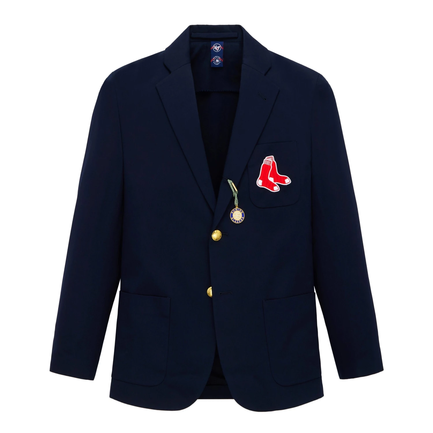Men’s Rowing Blazers x ’47 cotton twill Red Sox blazer featuring a 3-roll-2 silhouette, three patch pockets, quarter-inch topstitch “swelled seam” finishing and an embroidered team logo on the chest pocket. Cut to the original 1852 blazer pattern.