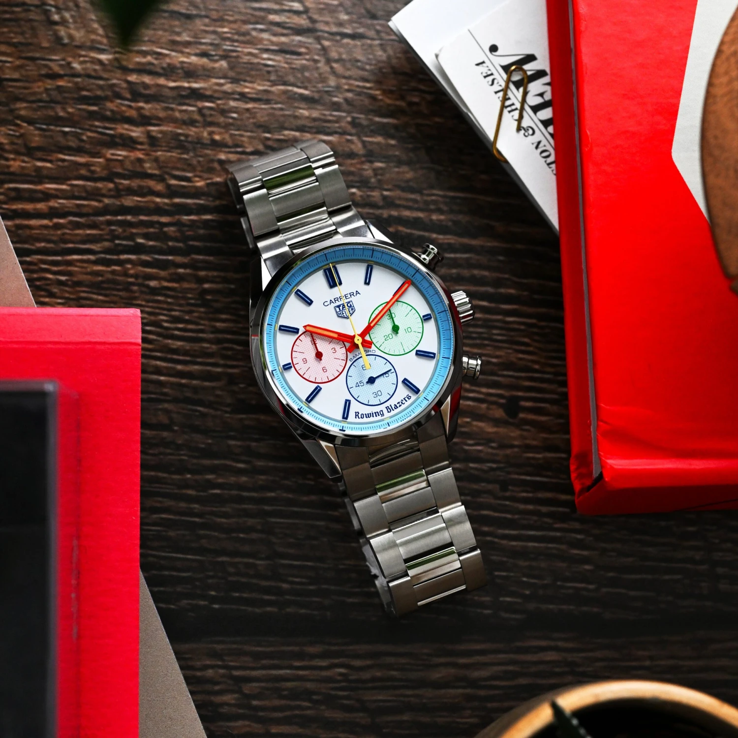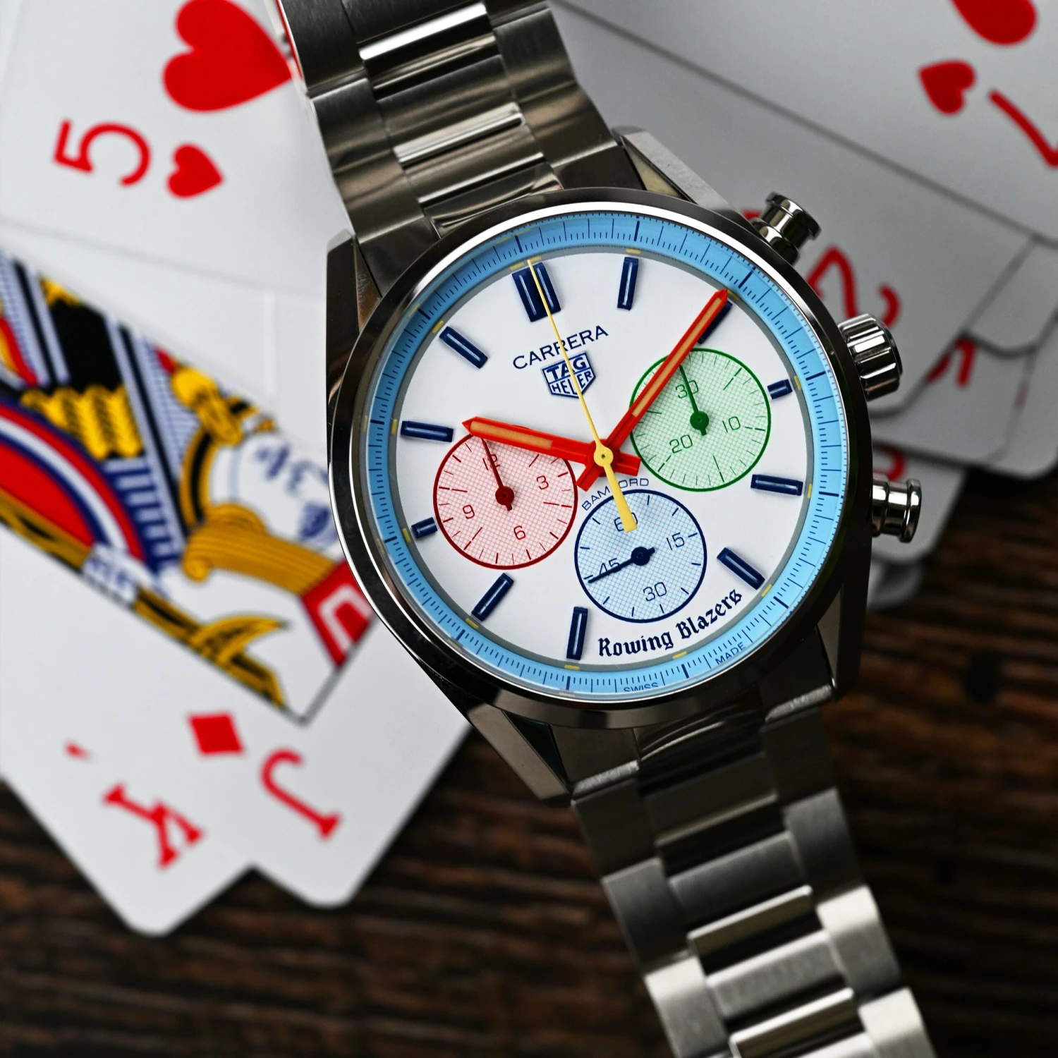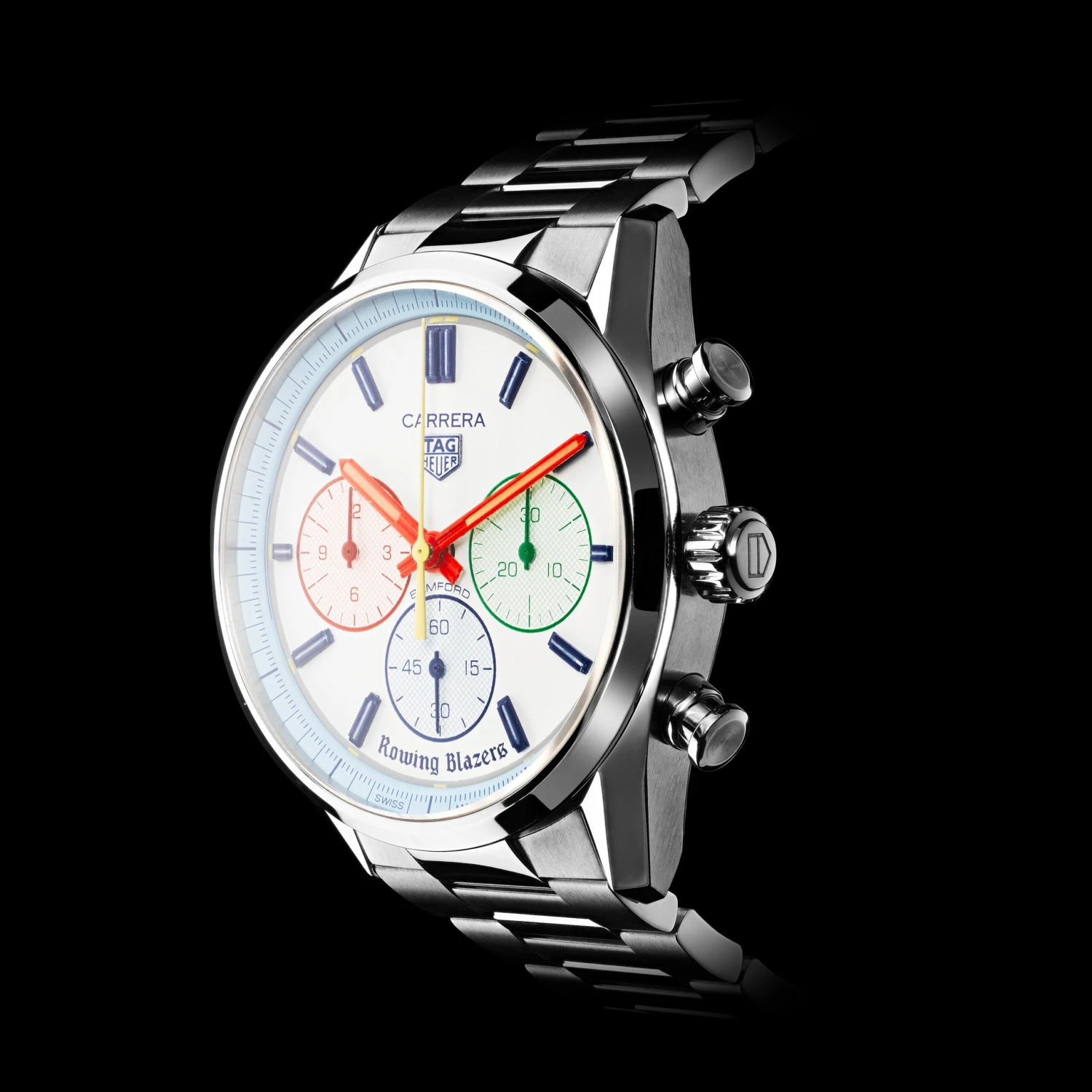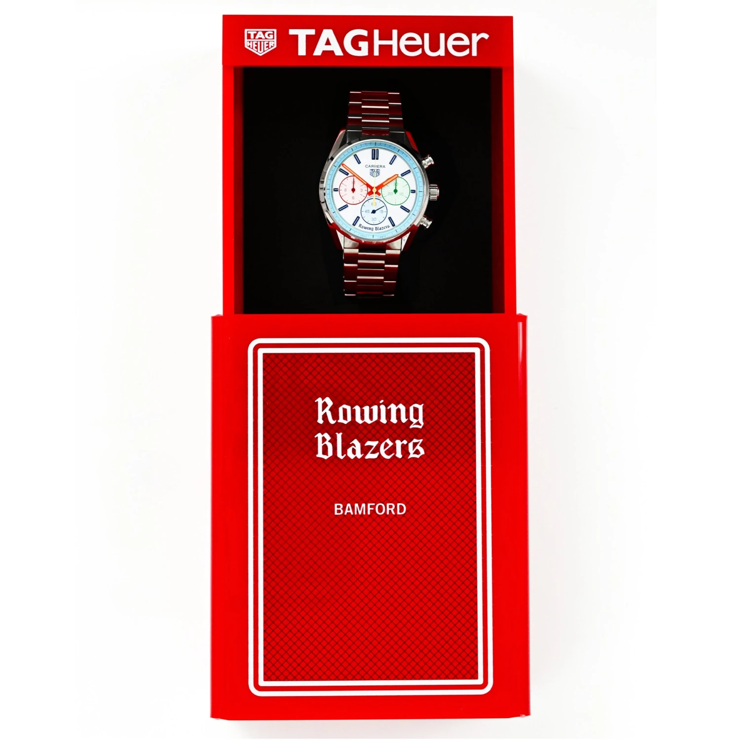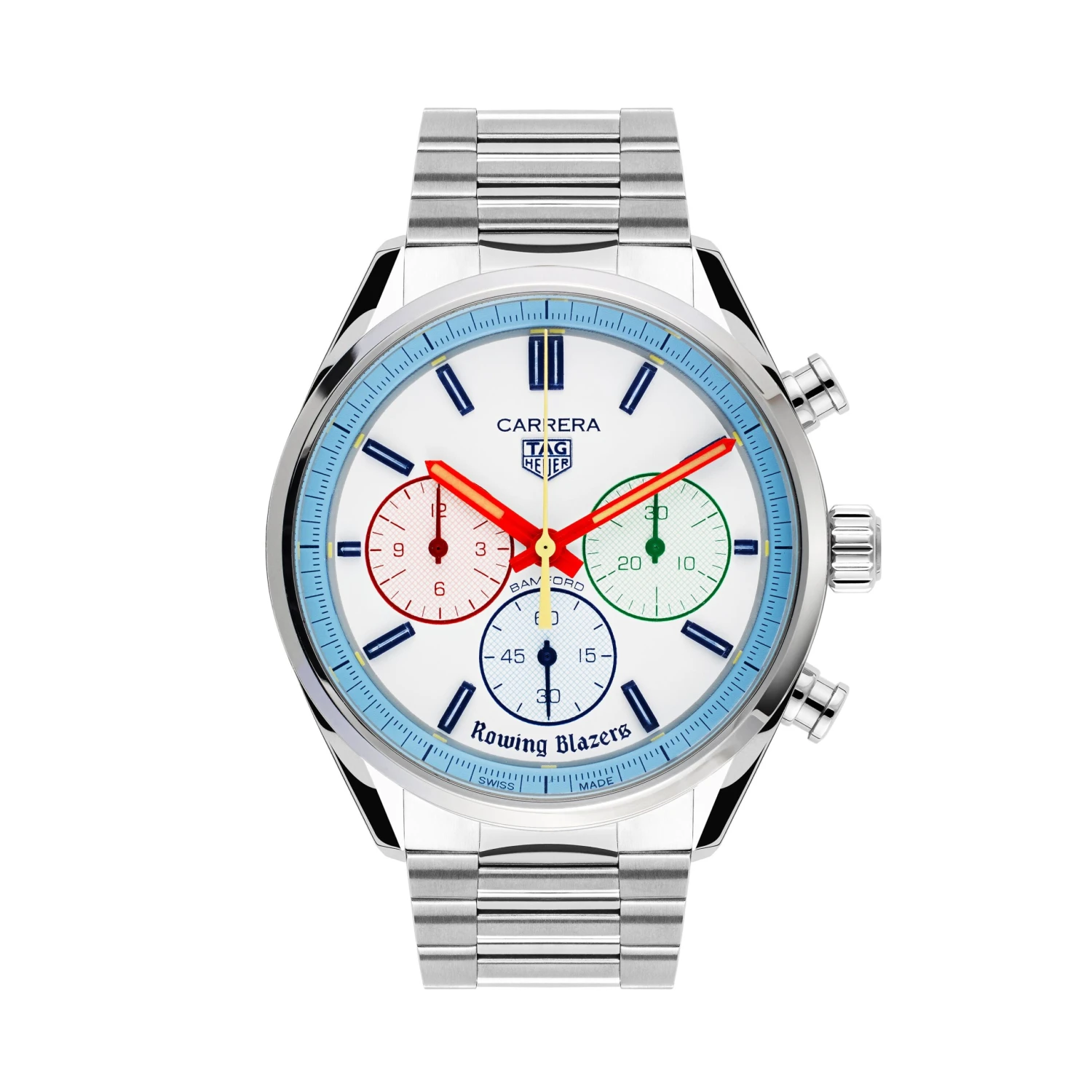 “I’ve always loved the Heuer Yacht-Timer — both for its sporting origins and its very Rowing Blazers color scheme, but also because there’s something very Roy Lichtenstein about the way the colors are rendered,” explains our founder Jack Carlson, who designed the watch with Bamford and vintage watch expert (and friend of the brand) Eric Wind of Wind Vintage. “Eric loves vintage Heuer stopwatches too, and we’ve dreamed of producing our own watch in the style of these amazing pieces. It’s a dream to work with TAG Heuer and Bamford to make this a reality.”