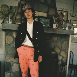 Handmade cloisonné buttonhole badge included. Eight brass bee buttons struck from a vintage die on front. Five working brass beehive cuff buttons struck from a vintage die on each cuff. Double vents. 8×3 silhouette. Two flap pockets. Single-welt pocket at chest. Cross-stitched Latin under the lapel (VBI MEL IBI APES, “You catch more bees with honey”). Rowing Blazers house lining (navy with narrow green stripes). 100% tropical weight wool. Made in Portugal.