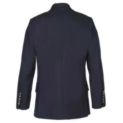 Men’s navy blue double-breasted blazer in tropical weight wool featuring a rare 8×3 button stance (8 front buttons, 3 rows closing), and 5 working buttons on each cuff, flap pockets, and a cross-stitched Latin cri-de-guerre embroidered under the lapel. Handmade in Portugal.