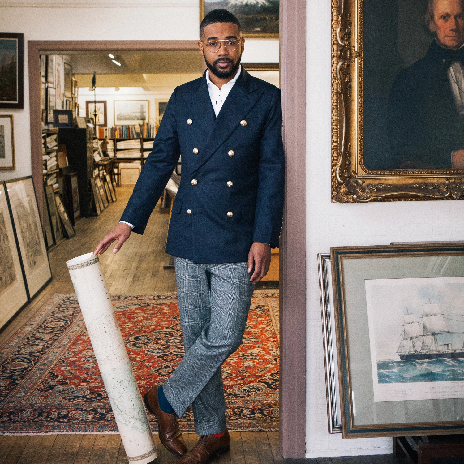 H.M. the King, formerly the Prince of Wales, has an 8×3 double breasted blazer he has worn often for the past several decades. It looks as great today as it did in the 1970s. 8×3 refers to the total number of buttons on the front (eight) and the number or rows that button (three): this is a sharp, old-school cut that few have had the cojones to make in recent years. Ours is hand tailored, and, like Charlie’s, has five working buttons on each cuff (a feature of many blazers worn by British royals which dates back to the Duke of Windsor — whose five cuff buttons were a reference to the uniforms of the Welsh Guards). The Drones Club buttons on the front and matching beehive cuff buttons complement the secret stitching under the lapel, VBI MEL IBI APES: ‘You catch more bees with honey.’