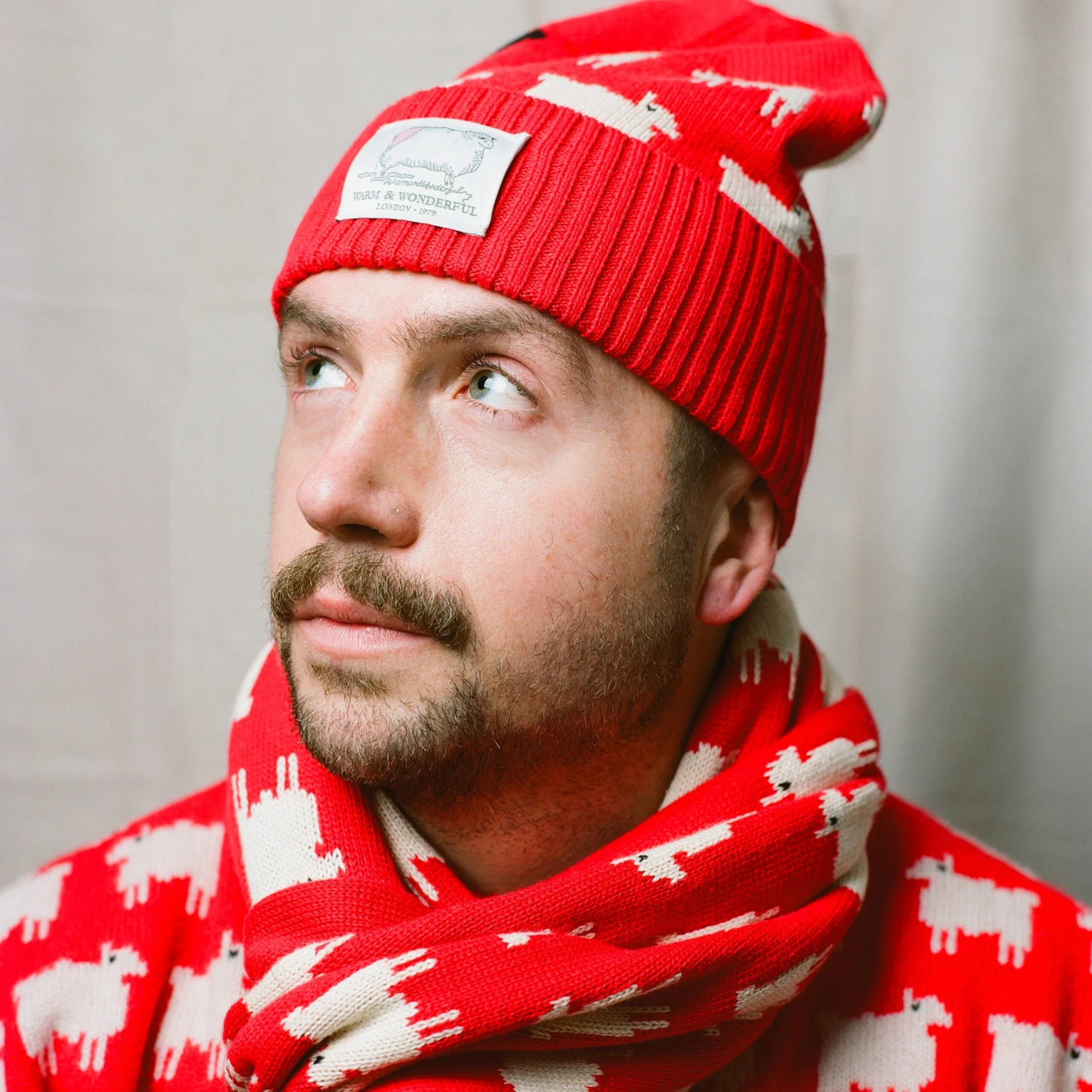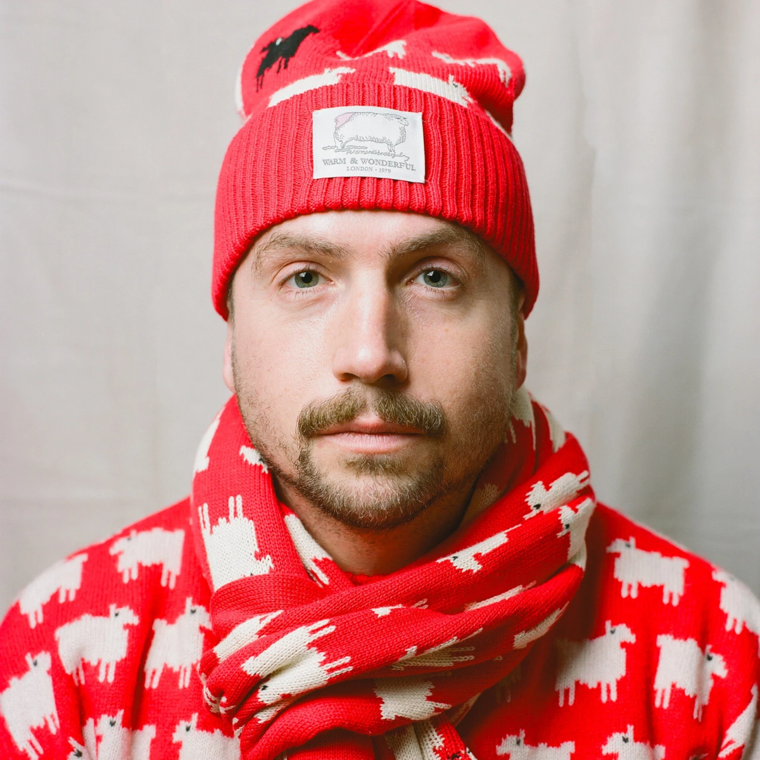 Cotton scarf featuring Warm & Wonderful’s iconic “Black Sheep” pattern.