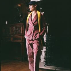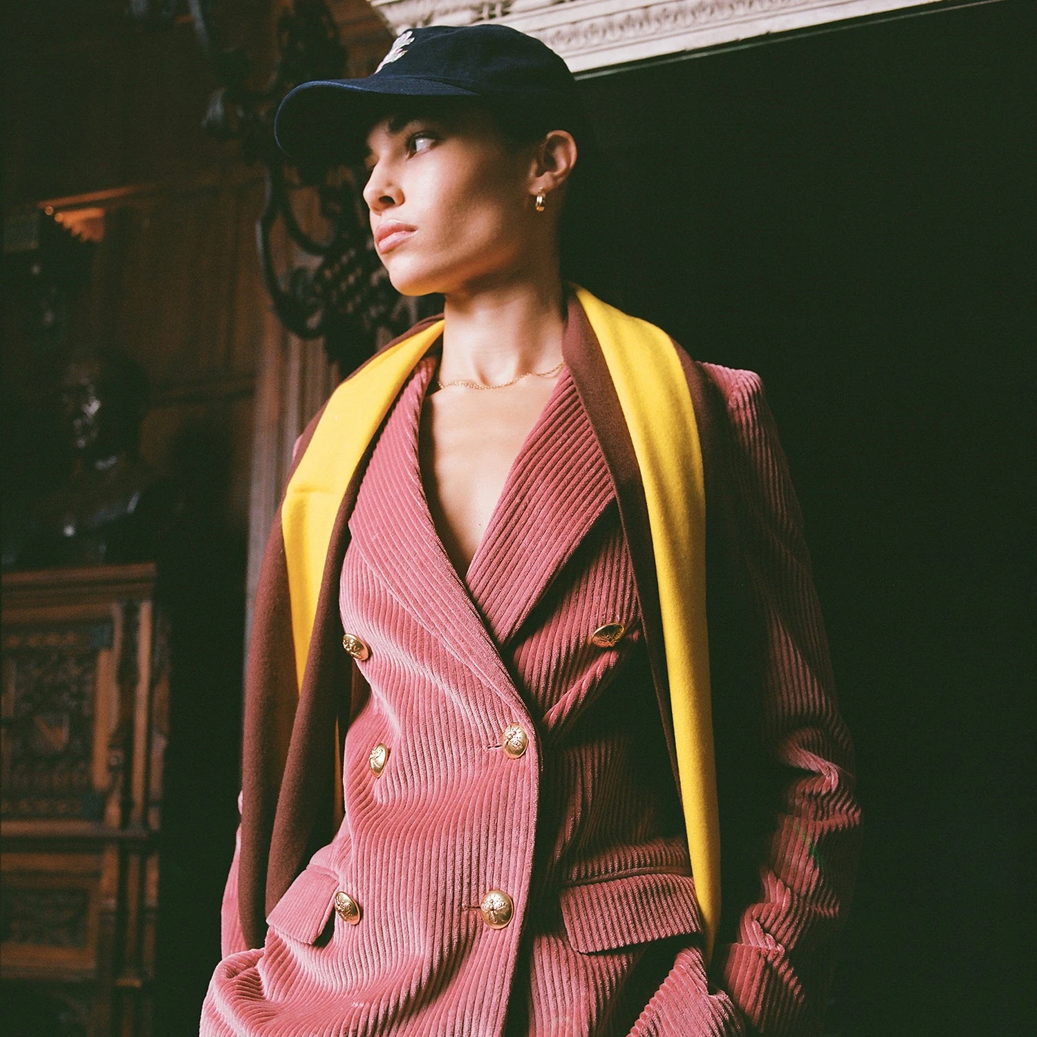 Ultra-soft women’s wide-wale Italian corduroy 6×2 double-breasted jacket.
