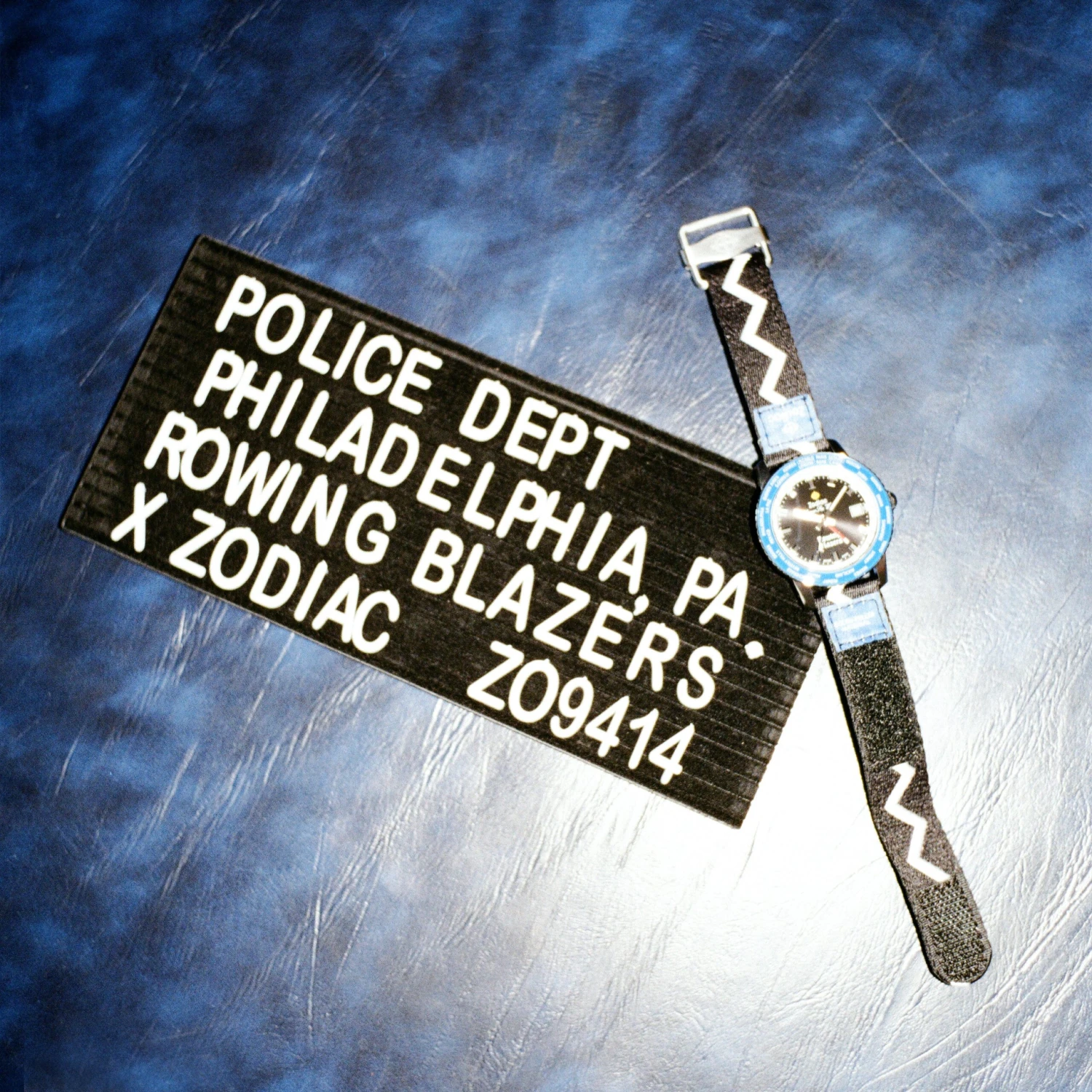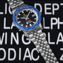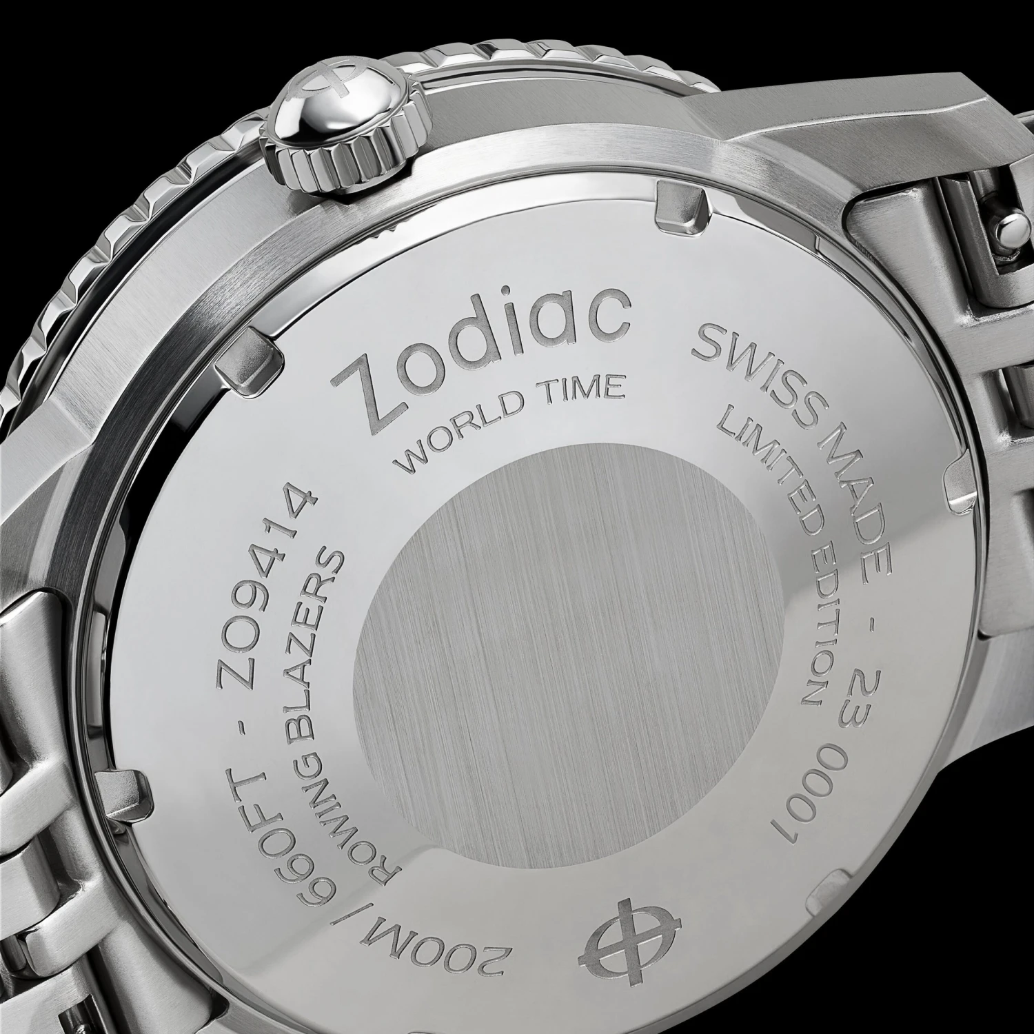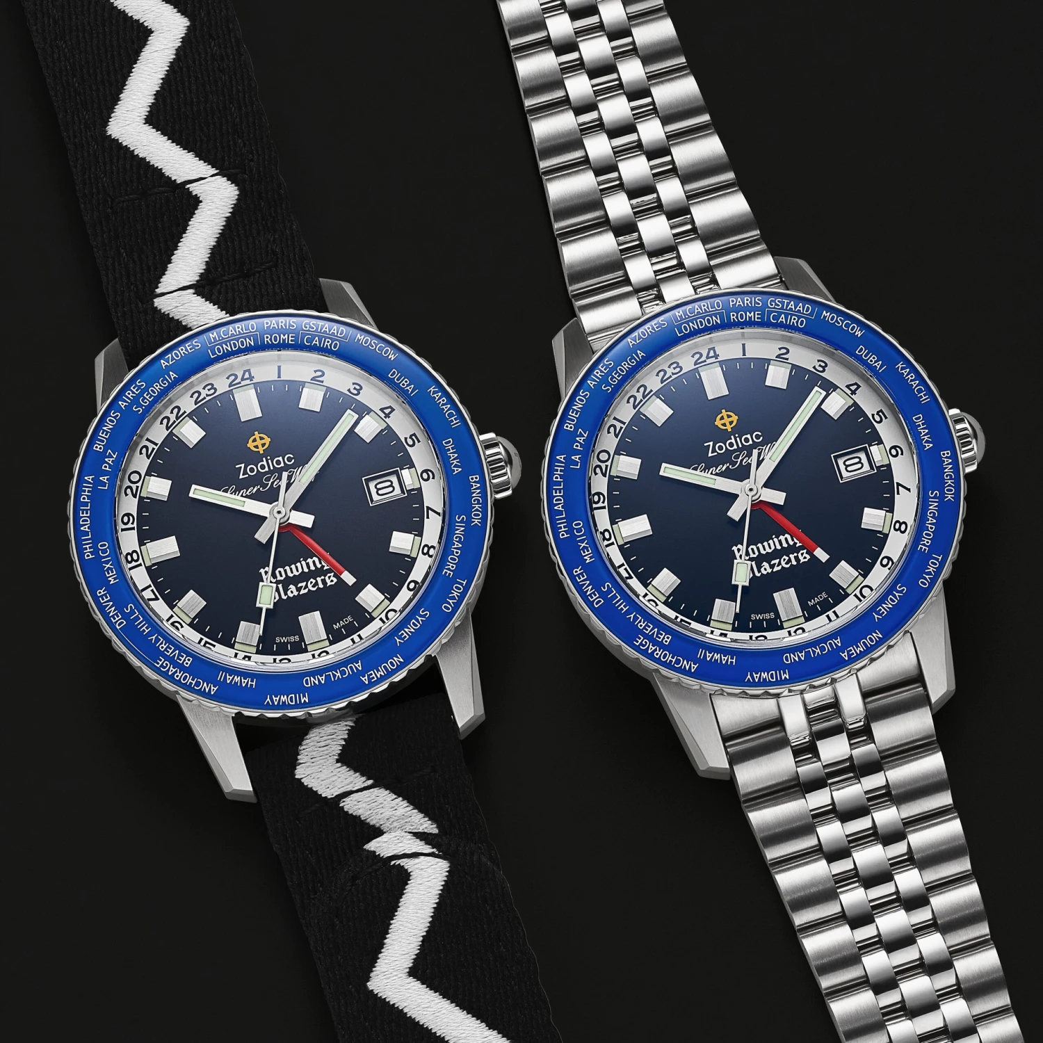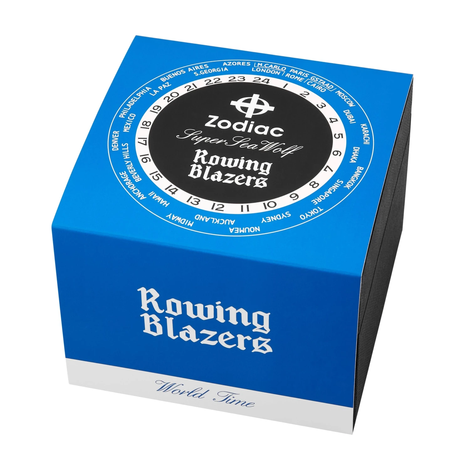 Inspired by one of our favorite holiday movies, the limited-edition Zodiac x Rowing Blazers Super Sea Wolf World Time GMT timepiece features a rotating World Time bezel with traditional GMT tracker, a co-branded black dial, Super LumiNova hands and markers, a classic 5-link stainless steel bracelet, and an additional military-style #tide strap made from 100% recycled ocean plastic. Limited edition of 282.