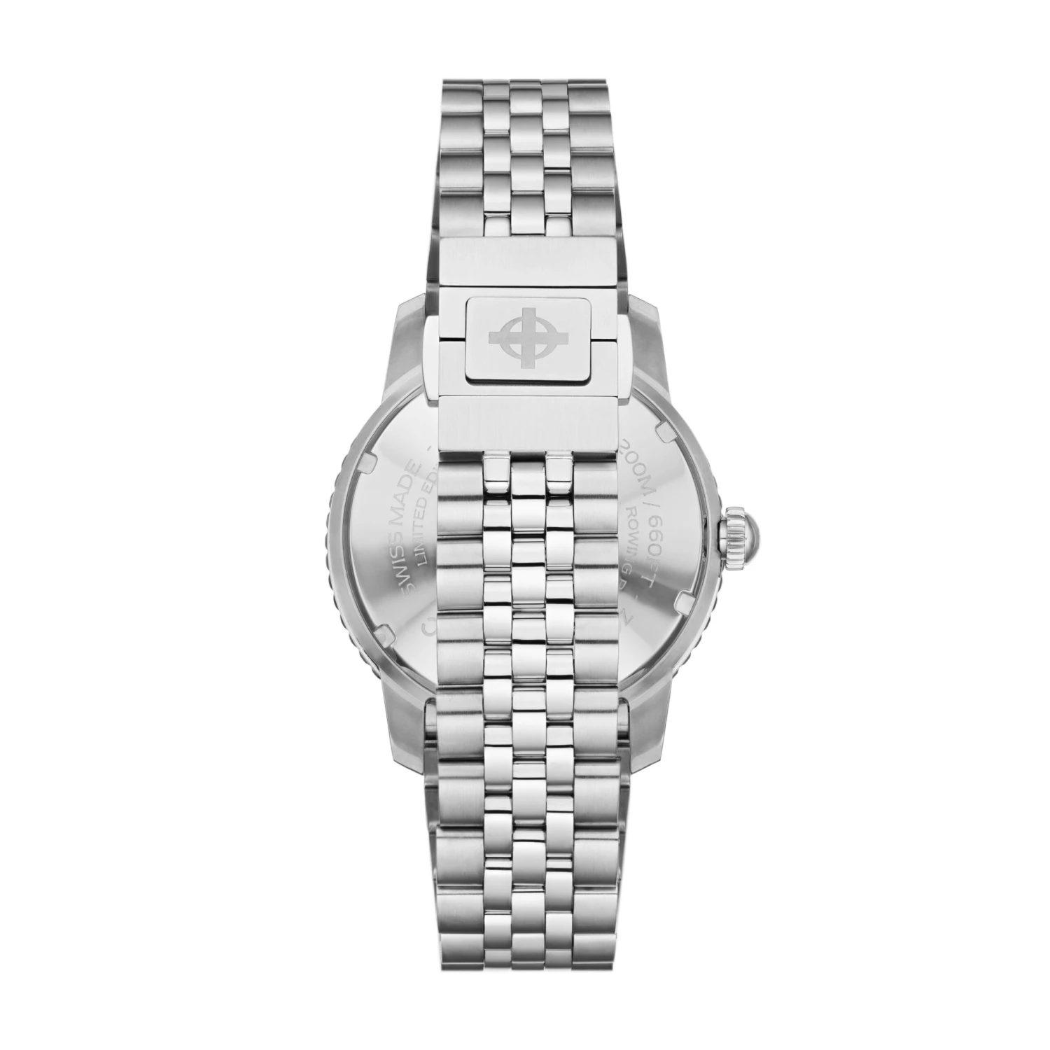 40mm case. 13.6mm case thickness. 20mm lug width. Swiss-made STP 7-20 automatic movement. Water resistant to 20 atmospheres. Rotating World Time bezel with 27 locations. Super LumiNova hands and markers. 5-link stainless steel bracelet. Additional military-style #tide strap. Limited to 282 units. Hand-crafted in Switzerland.
